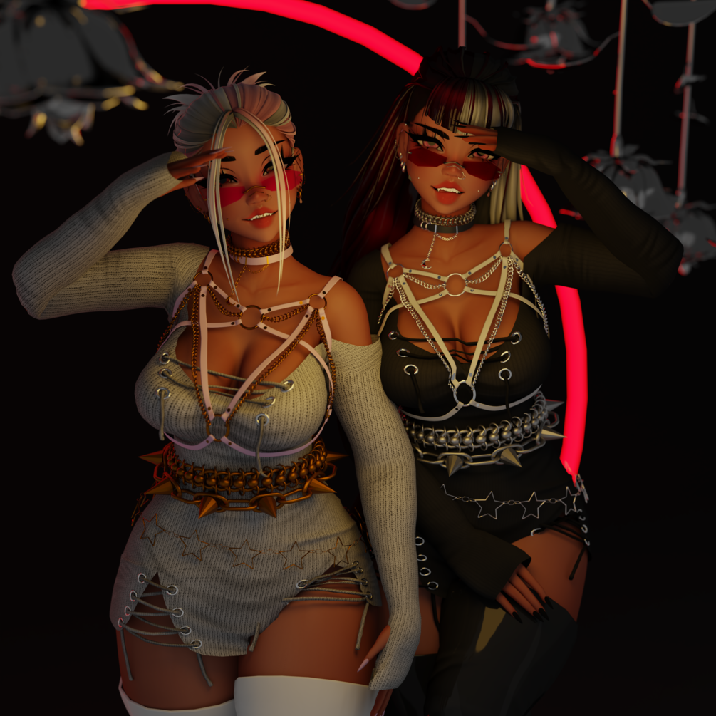 body, boots: zinpia ( https://zinpia.sellfy.store/ ) body texture: HoneyLab ( https://www.honeylab.store/ )head, hair: Nessy ( https://nessy.store/ )eye, hair texures: wetcat ( https://wetcat.gumroad.com/ )dress: rinebean ( https://rinebean.gumroad.com/ )harness: Eli ( https://giveaoof.gumroad.com/ )glasses: cosmichaivr ( https://cosmichaivr.gumroad.com/ )choker: kri ( https://krinuts.gumroad.com/ )tongue: VastayaVR ( https://payhip.com/VastayaVR )belts, chain choker: AATT Alces ( https://alces.gumroad.com/ )render scene: teacakezz ( https://teacakezz.gumroad.com/ )